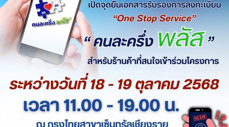 วันอาทิตย์ที่ 19 ตุลาคม 2568 เทศบาลนครเชียงรายโดย นายวันชัย จงสุทธานามณี นายกเทศมนตรีนครเชียงราย มอบหมายให้ นายอิทธิพล สุนทรสีมะ รองปลัดเทศบาลนครเชียงราย ว่าที่รต.บุญญฤทธิ์ อายุยืน รองปลัดเทศบาลนครเชียงราย ข้าราชการและเจ้าหน้าที่ ร่วมให้บริการและอำนวยความสะดวกแก่ร้านค้า ผู้ประกอบการ ที่สนใจเข้าร่วมลงทะเบียนโครงการ “คนละครึ่ง พลัส ” ระหว่างวันที่ 18 – 19 ตุลาคม 2568 ตั้งแต่เวลา 11.00 – 19.00 น. ณ ธนาคารกรุงไทยสาขาเซ็นทรัล