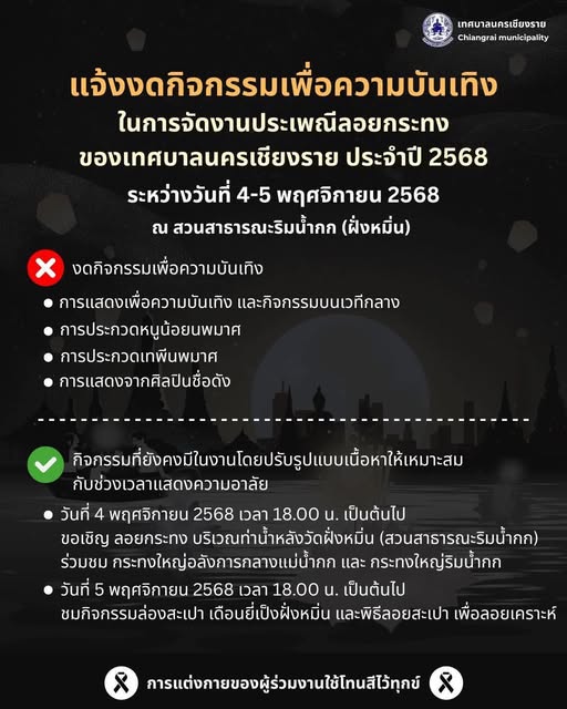 จึงขอแจ้งงดกิจกรรมเพื่อความบันเทิงและปรับเปลี่ยนแผนการจัดงานประเพณีลอยกระทงของเทศบาลนครเชียงราย ประจำปี 2568 ระหว่างวันที่ 4-5 พฤศจิกายน ทั้งนี้ประชาชนและนักท่องเที่ยวสามารถลอยกระทงเพื่อสืบสานประเพณีได้ตามปกติ