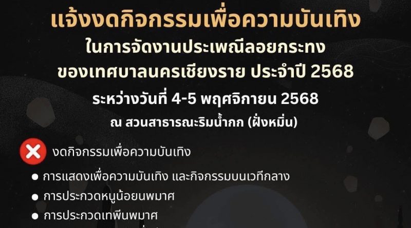 เทศบาลนครเชียงราย แจ้งงดกิจกรรมเพื่อความบันเทิงในการจัดงานประเพณีลอยกระทงของเทศบาลนครเชียงรายประจำปี 2568 ระหว่างวันที่ 4-5 พฤศจิกายน 2568
