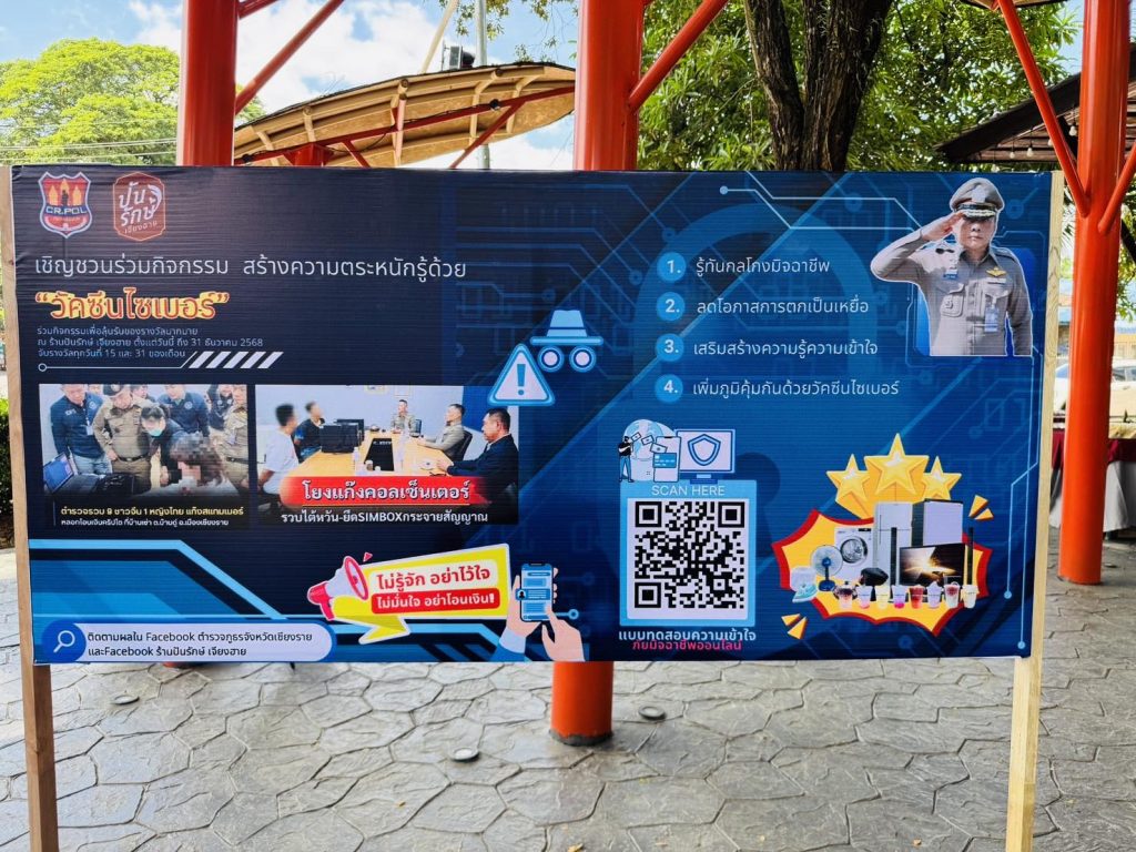 วันที่ 24 ต.ค.2568 ที่ร้านกาแฟปันรักษ์ อ.เมืองเชียงราย พล.ต.ต.มานพ เสนากูล ผู้บังคับการตำรวจภูธรจังหวัดเชียงราย ได้ทำโครงการวัคซีนไซเบอร์ เพื่อสร้างภูมิคุ้มกันการถูกหลอกออนไลน์ ทั้งทางโทรศัพท์ หรือทางโซเชียล โดยเชิญชวนให้ประชาชนมาทำกิจกรรมตอบคำถาม ในแบบสอบถามเพื่อประเมินการถูกหลอกลวง ผ่านช่องทางต่างๆ เพื่อเป็นการเสริมสร้างในการรู้เท่าทันมิจฉาชีพที่จะเข้ามาหลอกลวงในรูปแบบต่างๆ โดยหลังจากทำแบบทดสอบแล้วจะมีการจับรางวัลทุกวันที่ 1 และ 15 ของทุกเดือนโดยมีรางวัลใหญ่เป็นทีวี และตู้เย็นอีกด้วย