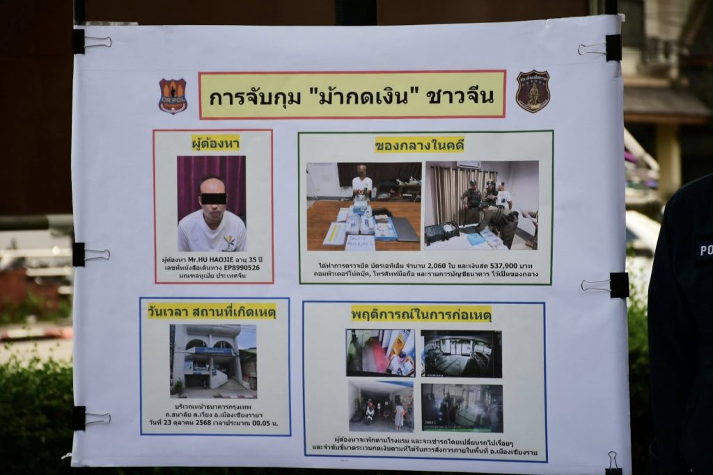 สำหรับการจัมกุมชายชาวจีน พร้อมบัตรเอทีเอ็ม 2,057 ใบ เกิดขึ้นเมื่อวันที่ 23 ตุลาคม 2568 เวลาประมาณ 00.04 น. เจ้าหน้าที่ตำรวจชุดจับกุม สภ.เมืองเชียงราย ออกตรวจ พื้นที่บริเวณหน้าธนาคารกรุงเทพ ถนนธนาลัย ตำบลเวียง อำเภอเมืองเชียงราย พบชายชาวจีนมีท่าทางพิรุธ เมื่อเรียกตรวจได้พยายามวิ่งหลบหนี ทางเจ้าหน้าที่ตำรวจได้ควบคุมตัวเอาไว้ ในเบื้องต้นทราบชื่อคือ Mr. HU HAOJIE อายุ 35 ปี สัญชาติจีน ตรวจค้นพบ บัตรเอทีเอ็ม หลายธนาคาร และสลิปโอนเงินหลายรายการ จึงควบคุมตัวสอบสวน