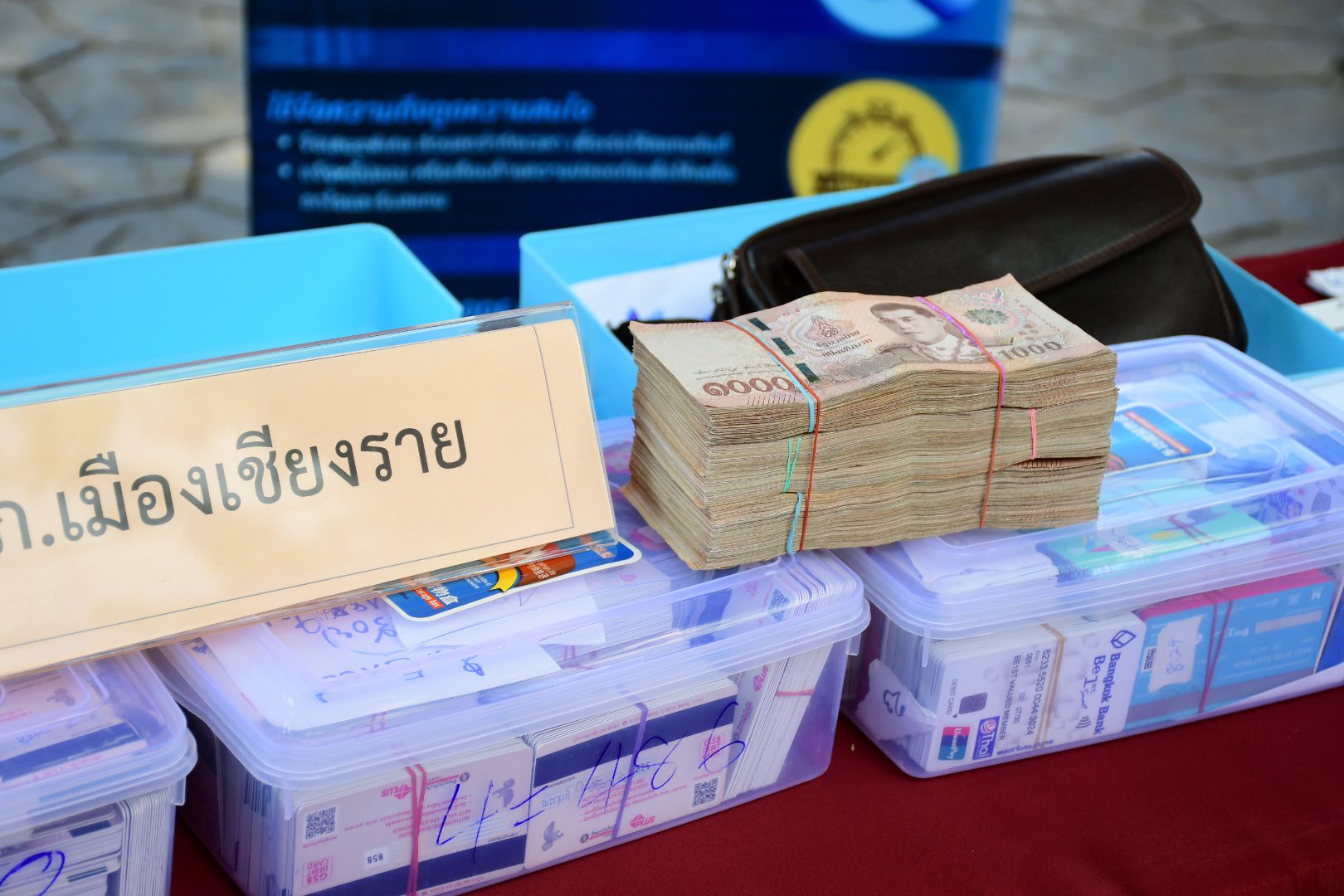อีกราย เจ้าหน้าที่ตำรวจ สภ.เชียงแสน ได้รับแจ้งจากสายลับว่าจะมีการลักลอบส่งสมุดบัญชี บัตรอิเล็กทรอนิกส์ และซิมการ์ด ผ่านบริษัทขนส่ง เอกชน เพื่อส่งต่อไปประเทศลาว โดยฝากไว้ที่จุดฝากรถหน้าด่านสามเหลี่ยมทองคำ อ.เชียงแสน จ.เชียงราย ตำรวจจึงวาง กำลังซุ่มตรวจ จนพบรถขนส่งบริษัทเอกชน นำพัสดุมาส่ง มีชายชื่อ นายรุ่งโรจน์ รับพัสดุไป เจ้าหน้าที่จึงแสดงตัวตรวจ ค้น พบของกลางเป็นสมุดบัญชี บัตรอิเล็กทรอนิกส์ และซิมการ์ดจำนวนมาก ต่อมาเจ้าหน้าที่ขยายผลตรวจยึดพัสดุเพิ่มเติมจากบริษัทเอกชนในพื้นที่ พบของกลางลักษณะ เดียวกันหลายรายการ เครือข่ายนี้เกี่ยวข้องกับการลักลอบส่งบัญชีและบัตรไปให้กลุ่ม “จีนเทา” ที่ลาว เพื่อใช้ในแก๊งสแกม เมอร์สร้างความเสียหายแก่ประชาชน โดยตำรวจภูธรจังหวัดเชียงราย จะเร่งขยายผลและยึดทรัพย์เครือข่ายตามนโยบาย รัฐบาลและผู้บัญชาการตำรวจแห่งชาติ