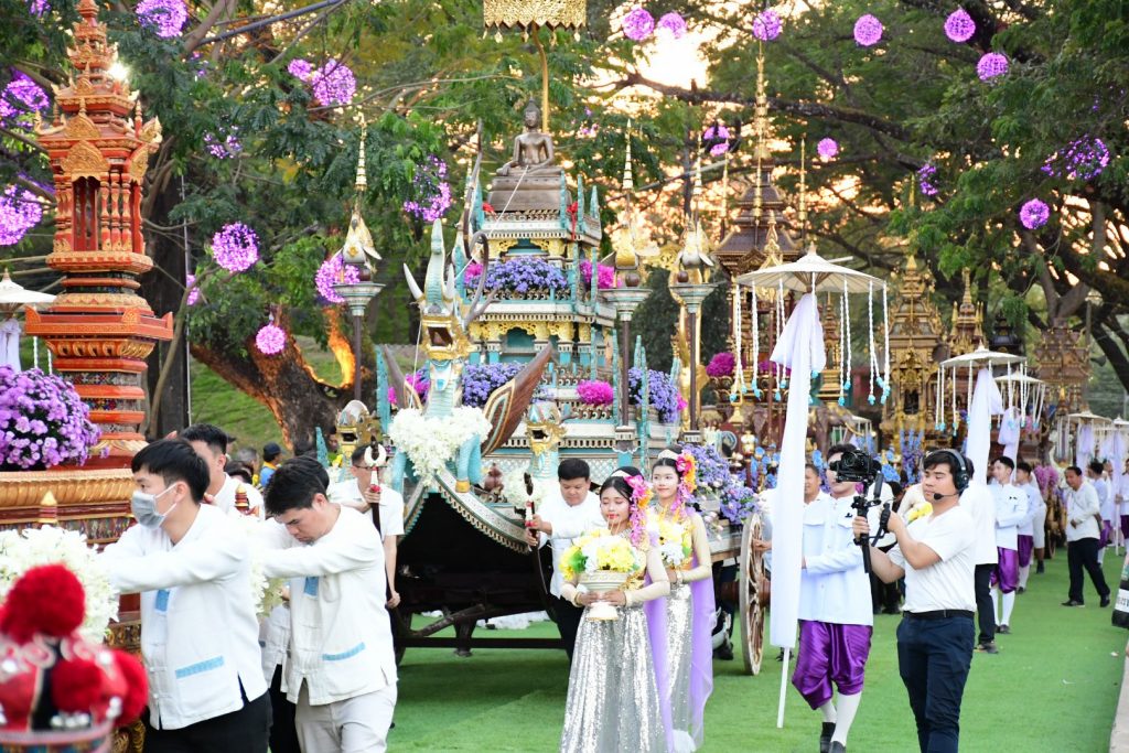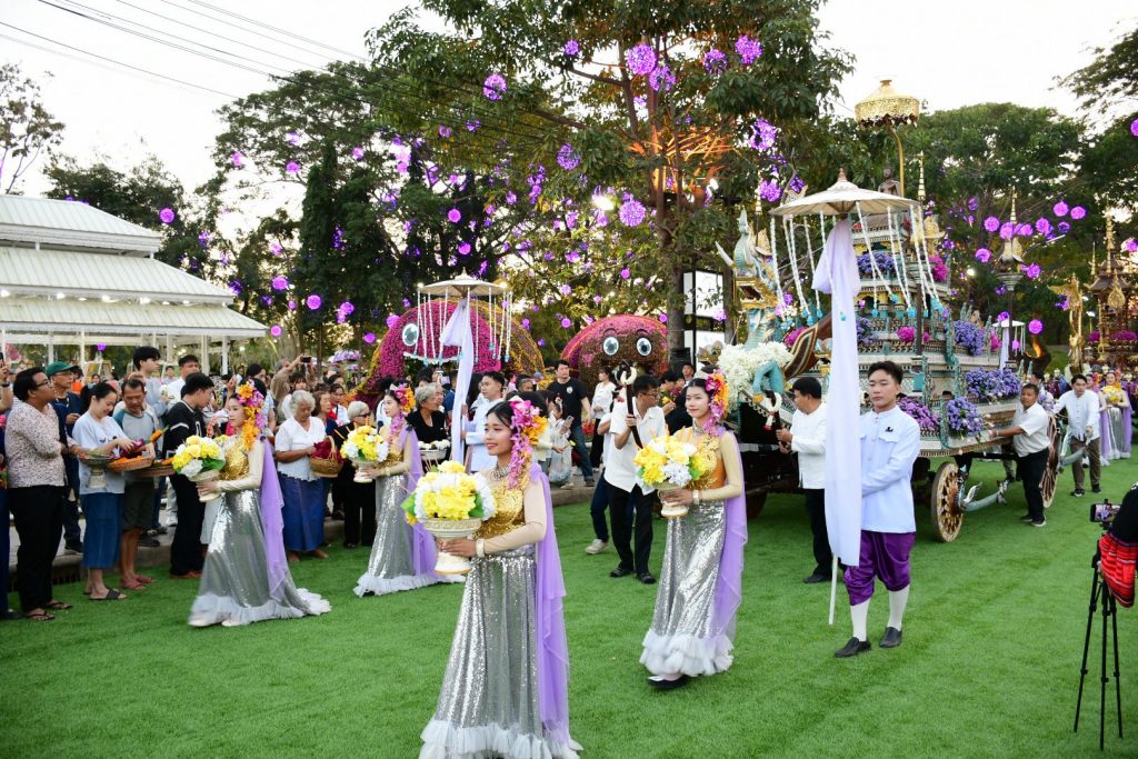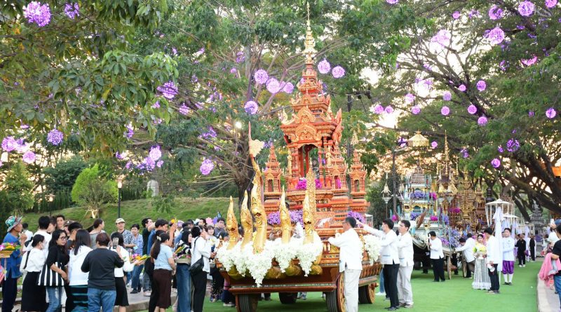 นักท่องเที่ยวคึกคัก ร่วมตักบาตรดอกไม้หนึ่งเดียวในล้านนา ถวายดอกไม้พระพุทธรูปคู่เมือง บนราชรถ 9 คัน