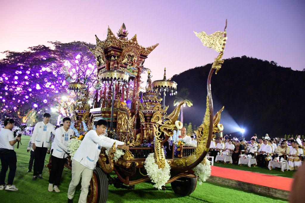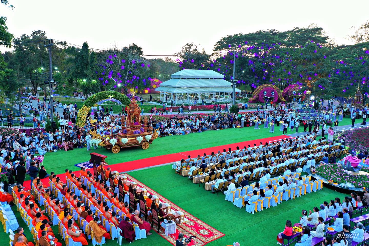 ไฮไลต์สำคัญของงาน คือการอัญเชิญพระพุทธรูปเก่าแก่ 9 องค์ ขึ้นประดิษฐานบนราชรถจาก 9 จังหวัดภาคเหนือตอนบน เคลื่อนขบวนให้ประชาชนและนักท่องเที่ยวได้ถวายดอกไม้เป็นพุทธบูชา ราชรถแต่ละคันมีเอกลักษณ์งดงามแตกต่างกัน ผลงานของศิลปินเชียงราย ใช้ระยะเวลาสร้างรวม 9 ปี และจะอัญเชิญออกให้สักการะเพียงปีละ 2 ครั้ง คือในพิธีตักบาตรดอกไม้ และพิธีตักบาตรวันขึ้นปีใหม่เท่านั้น