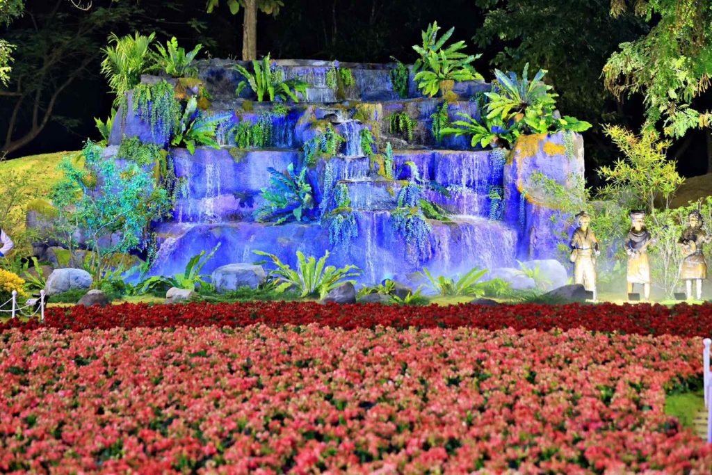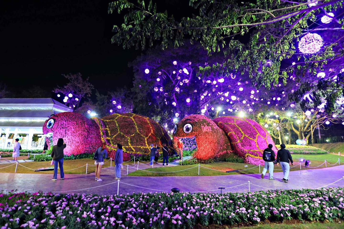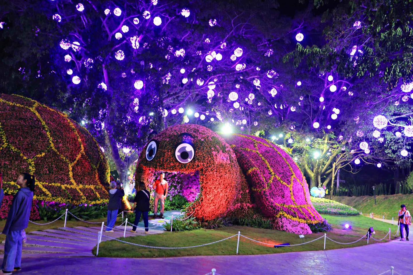 เมื่อเข้าสู่ช่วงค่ำคืน บรรยากาศภายในงานยิ่งงดงามไปอีกมิติหนึ่ง สวนดอกไม้ถูกแต่งแต้มด้วยแสงไฟหลากสี ส่องประกายท่ามกลางอากาศเย็น สร้างความละมุนตาและโรแมนติกแตกต่างจากช่วงกลางวันอย่างชัดเจน