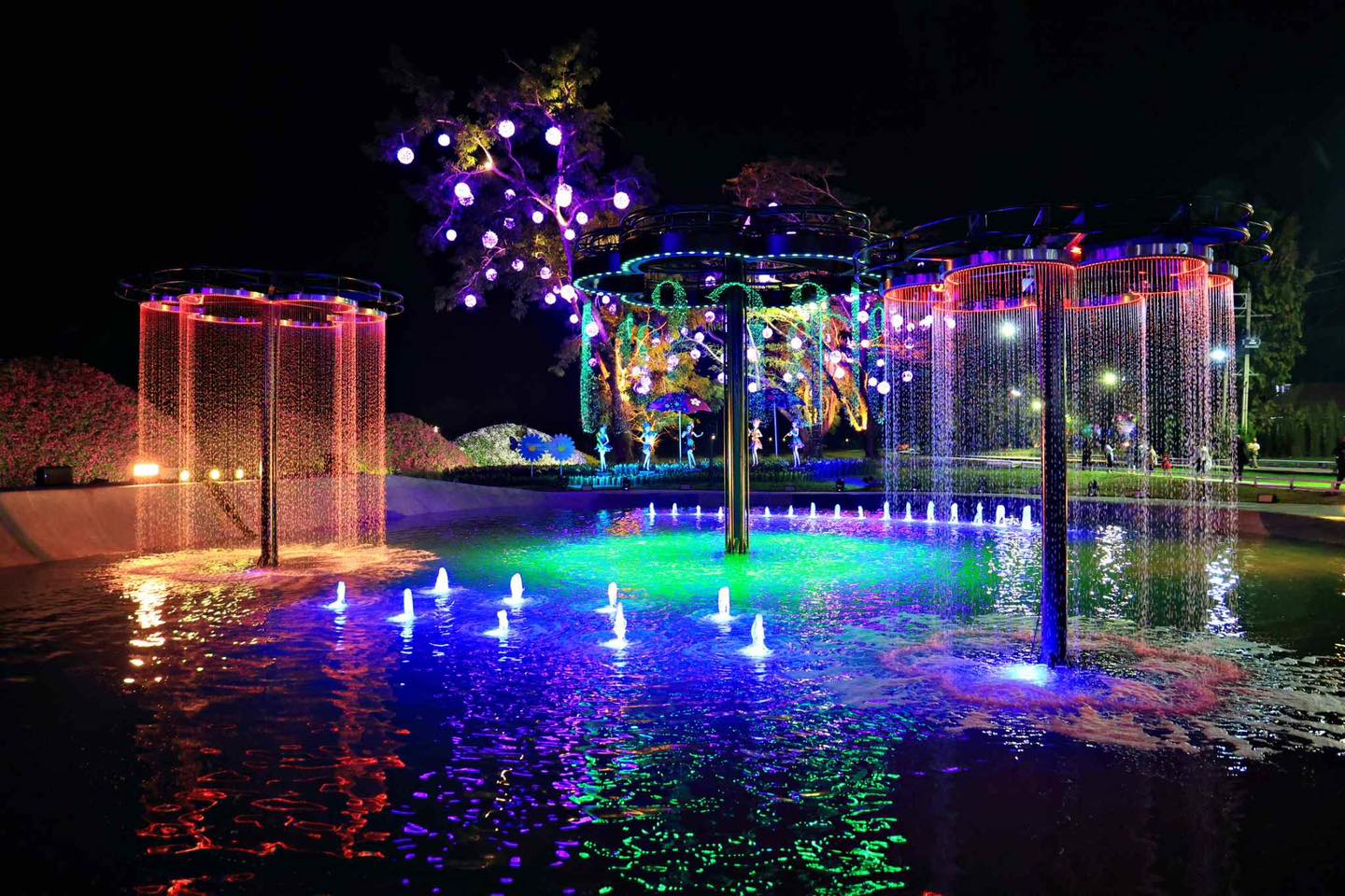 ขณะที่ไฮไลต์สำคัญของยามค่ำคืนน้ำพุนวัตกรรม การแสดงแสง สี เสียง ผ่านม่านน้ำตก ที่ผสานศิลปะ แสงไฟ และสายน้ำได้อย่างกลมกลืน เพิ่มความตระการตาและเรียกเสียงชื่นชมจากผู้เข้าชมตลอดการแสดง พร้อมกันนี้ทุกวันศุกร์บนเวที เชียงรายดอกไม้งามมีการแสดงโฟล์คซองขับกล่อมพร้อมชุดการแสดง และทุกค่ำคืนวันเสาร์จะมีสบับสับเปลี่ยนบนเวทีสร้างสรรค์และดนตรีในสวน Music in the Park ศิลปินมากมายมามอบความสุขกับฟรีคอนเสริต์