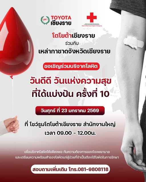 ร่วมแบ่งปัน “โลหิต” เพื่อช่วยชีวิตเพื่อนมนุษย์ โตโยต้าเชียงราย-เหล่ากาชาดจังหวัดเชียงรายขอเชิญทุกท่านร่วมบริจาคโลหิตวันดีดี วันแห่งความสุข ที่ได้แบ่งปัน ครั้งที่ 10