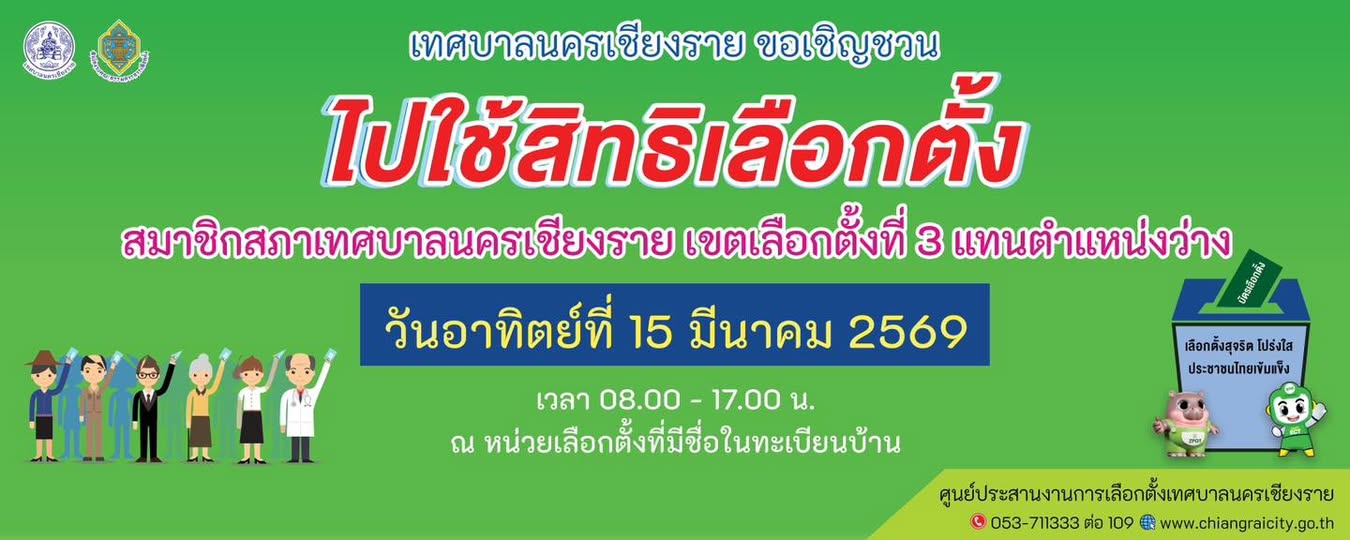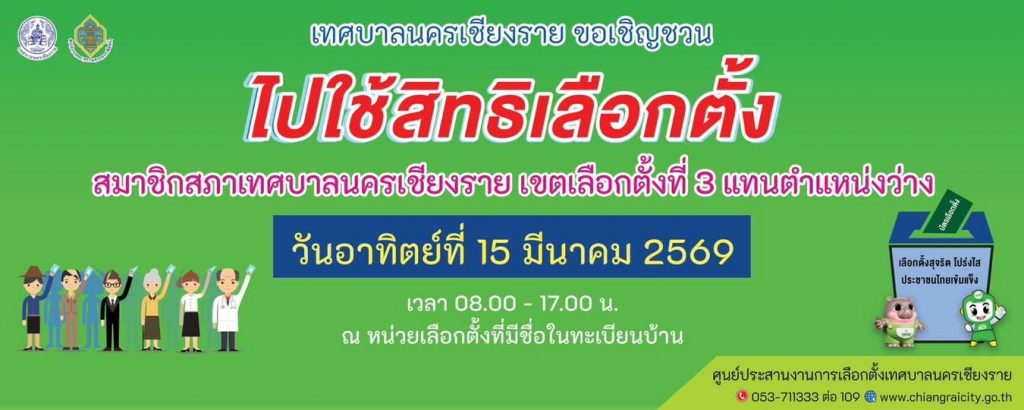 วันที่ 10 มีนาคม 2569 ผู้อำนวยการการเลือกตั้งประจำเทศบาลนครเชียงราย ประกาศกำหนดให้มีการเลือกตั้งสมาชิกสภาเทศบาลนครเชียงราย เขตเลือกตั้งที่ 3 กรณีแทนตำแหน่งที่ว่าง จำนวน 1 ตำแหน่ง