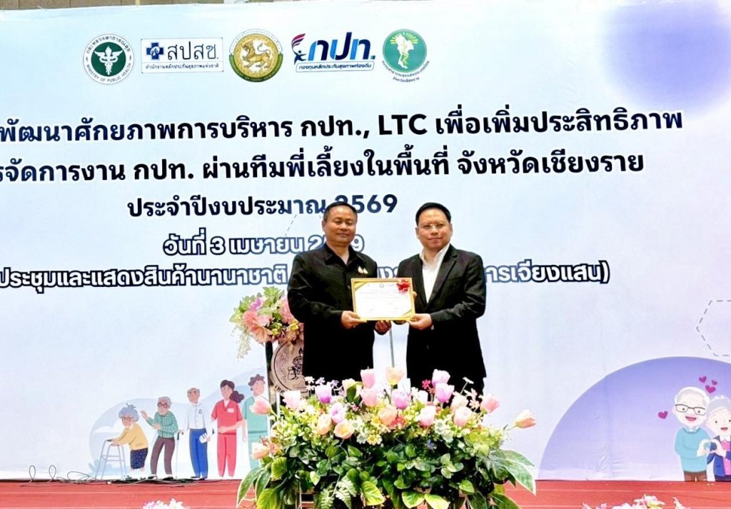 วันที่ 4 เมษายน 2569 นายวันชัย จงสุทธานามณี นายกเทศมนตรีนครเชียงราย ได้มอบหมายให้ นายจตุรัฐชัย จินตนาสิทธิคุณ รองปลัดเทศบาลนครเชียงราย รักษาราชการเเทนปลัดเทศบาลนครเชียงราย รับมอบเกียรติบัตร กองทุนหลักประกันสุขภาพ ระดับท้องถิ่นต้นแบบ จังหวัดเชียงราย ปี 2569 ในเวทีการประชุมพัฒนาศักยภาพการบริหาร กปท. LTC ผ่านทีมพี่เลี้ยงในพื้นที่จังหวัดเชียงราย ประจำปีงบประมาณ 2569 โดยได้รับเกียรติจาก นายรุจติศักดิ์ รังษี รองผู้ว่าราชการจังหวัดเชียงราย เป็นประธานในพิธี
