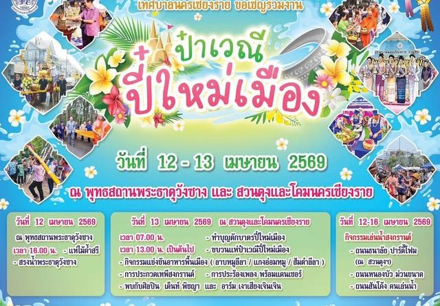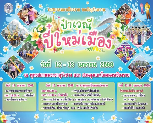 วันที่ 7 เมษายน 2569 เทศบาลนครเชียงรายโดย นายวันชัย จงสุทธานามณี นายกเทศมนตรีนครเชียงราย คณะผู้บริหาร สมาชิกสภา ข้าราชการ เจ้าหน้าที่ และพี่น้องประชาชนนครเชียงราย ร่วมจัดงานป๋าเวณีปี๋ใหม่เมือง เนื่องในประเพณีสงกรานต์ประจำปี 2569 ภายในงานมีกิจกรรมหลากหลาย อาทิ การแห่ไม้ค้ำสรี ตักบาตรวันขึ้นปี๋ใหม่ ขบวนแห่ปี๋ใหม่เมือง• พิธีสรงน้ำพระ • รดน้ำดำหัวผู้สูงอายุ • ปาร์ตี้โฟม• และกิจกรรมถนนวัฒนธรรม เทศบาลนครเชียงราย ขอเชิญทุกท่านร่วมแต่งกายชุดพื้นเมือง สัมผัสบรรยากาศล้านนา และเฉลิมฉลองปีใหม่ไทยไปด้วยกัน