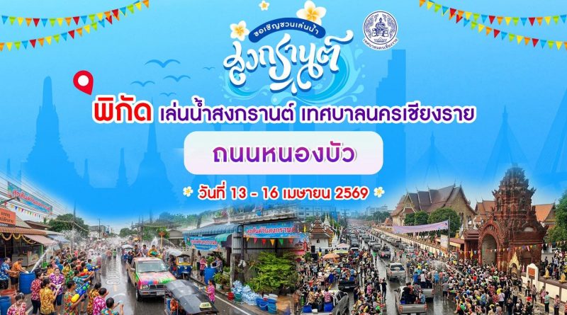 เมื่อวันที่ 8 เมษายน 2569 นายวันชัย จงสุทธานามณี นายกเทศมนตรีนครเชียงราย คณะผู้บริหารสมาชิกสภาเทศบาล ข้าราชการ พี่น้องประชาชน ขอเชิญชวนพี่น้องชาวเชียงรายและนักท่องเที่ยว ร่วมสัมผัสบรรยากาศ “ถนนคนเล่นน้ำ–แห่ไม้ค้ำสรี” ประเพณีปีใหม่เมืองนครเจียงฮาย ณ ชุมชนหนองบัว ในระหว่างวันที่ 13–16 เมษายน 2569 สนุกสนานกับการเล่นน้ำสาดความสุข พร้อมเรียนรู้วิถีวัฒนธรรมท้องถิ่นล้านนาอย่างใกล้ชิด