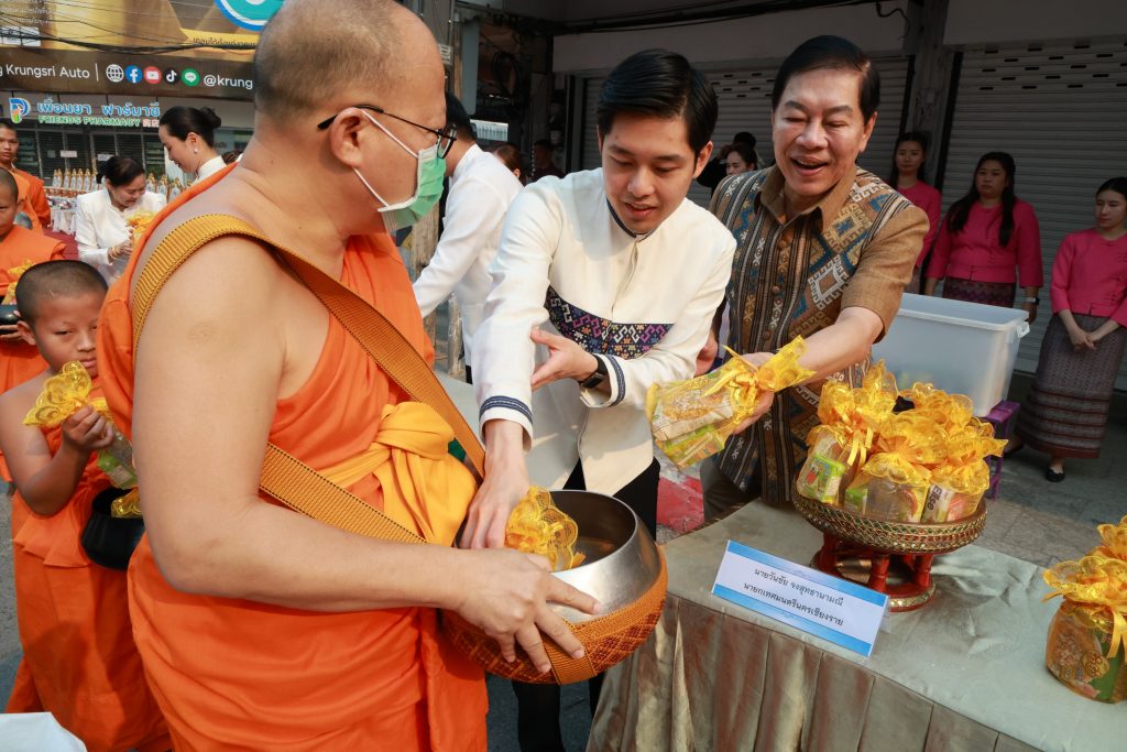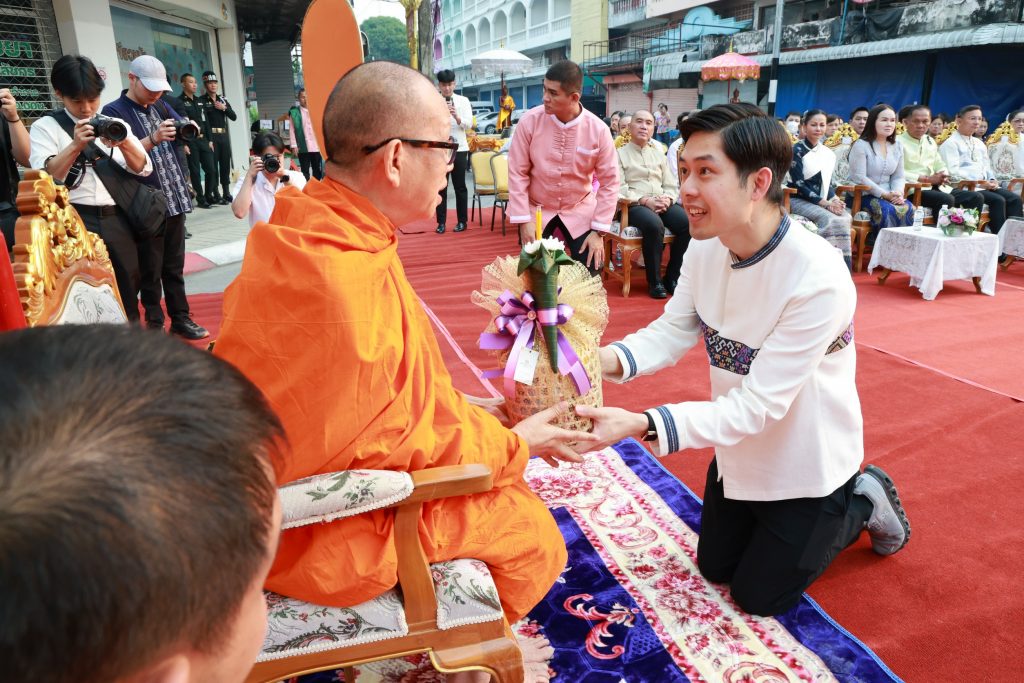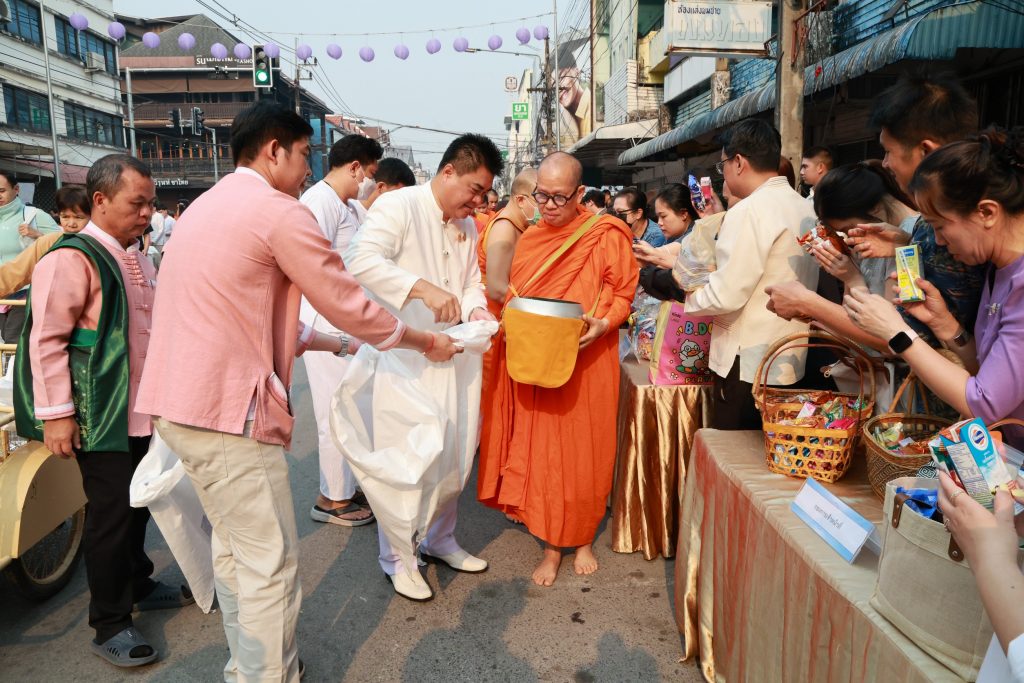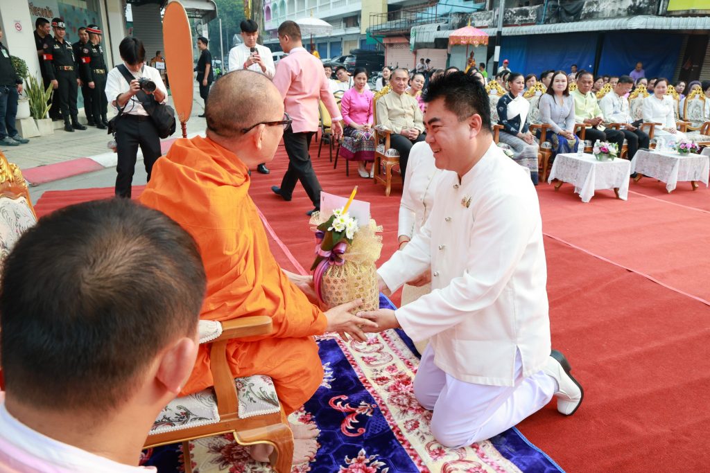 ในส่วนของพิธีทางศาสนา ได้รับเมตตาจากพระเดชพระคุณ พระรัตนมุนี ที่ปรึกษาเจ้าคณะจังหวัดเชียงราย วัดพระแก้ว พระอารามหลวง เป็นประธานฝ่ายสงฆ์ พร้อมด้วยพระภิกษุสามเณร จำนวน 74 รูป ออกรับบิณฑบาต เพื่อความเป็นสิริมงคลแก่ประชาชน.