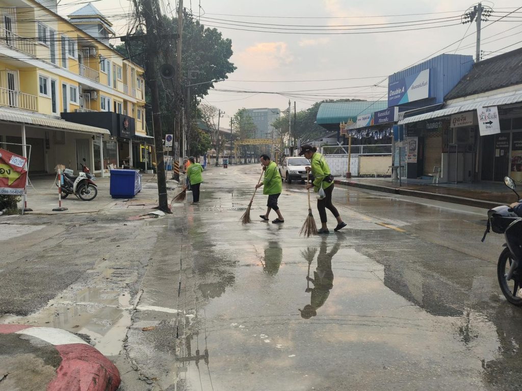 เจ้าหน้าที่ได้เร่งฉีดล้างคราบสกปรก เศษขยะ และสิ่งตกค้างจากการเล่นน้ำ พร้อมจัดเก็บขยะอย่างเป็นระบบ เพื่อป้องกันอุบัติเหตุและลดปัญหาสิ่งแวดล้อมในพื้นที่