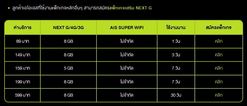สำหรับลูกค้าเอไอเอสที่ใช้งานแพ็กเกจหลักอื่นๆ สามารถสมัครแพ็กเกจเสริม NEXT G ได้ เริ่มต้นเพียง 89 บาท ใช้งานนาน 1 วัน (รับเน็ต 8 GB + AIS Super Wifi ไม่จำกัด)