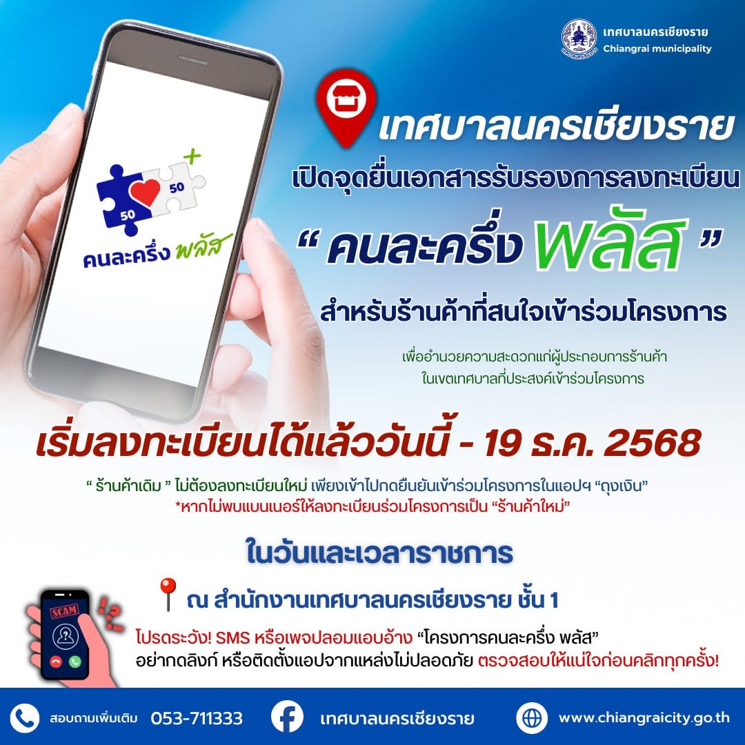 วันที่ 16 ตุลาคม 2568 เทศบาลนครเชียงราย เปิดจุดยื่นเอกสารรับรองการลงทะเบียน โครงการ “คนละครึ่ง พลัส” สำหรับ ผู้ประกอบการร้านค้า ลงทะเบียนเข้าร่วมโครงการตั้งแต่ บัดนี้ – วันที่ 19 ธันวาคม 2568